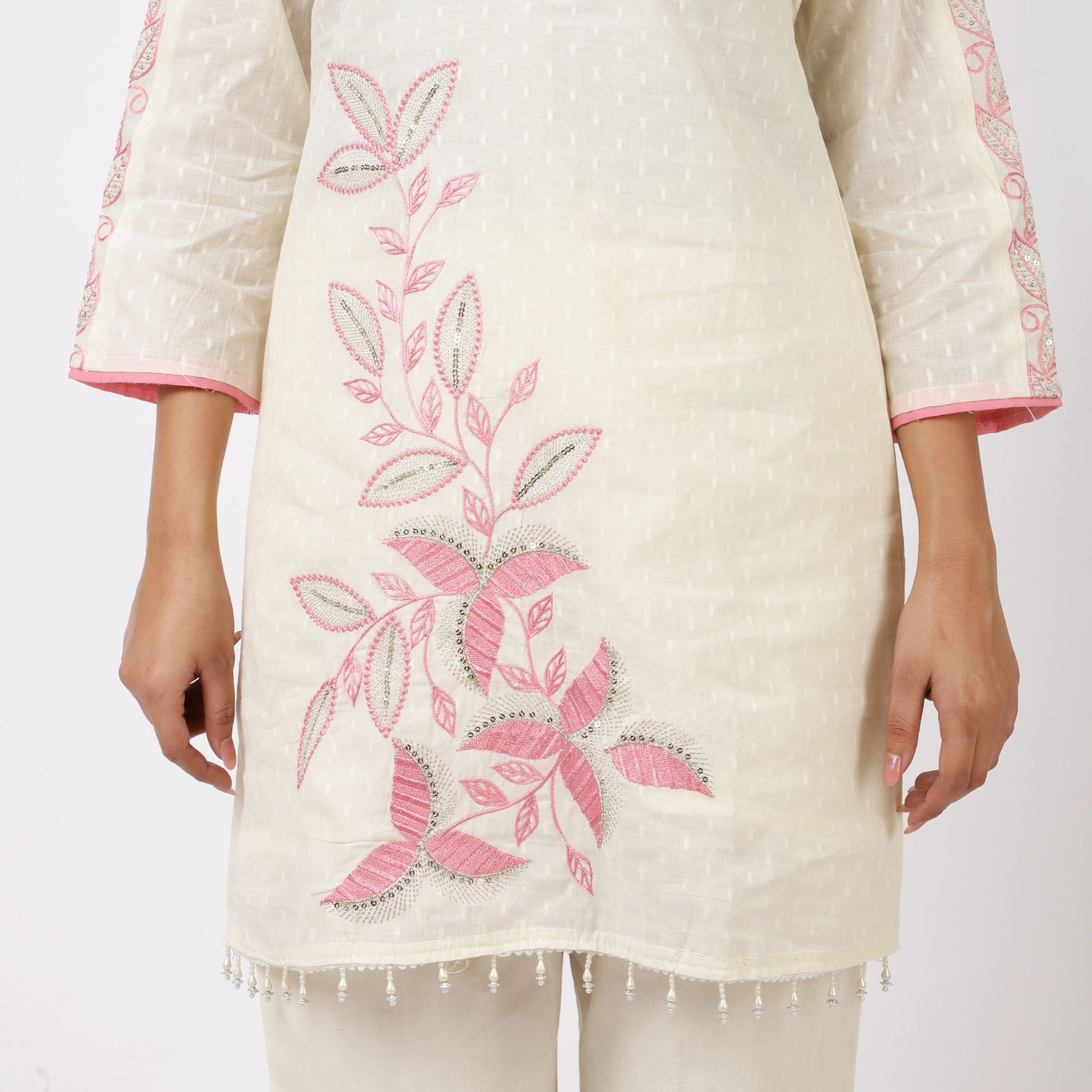 - DESIGN FEATURES: Elegant white cotton kurta set with delicate pink floral embroidery, featuring a V-neck and 3/4 sleeves for a contemporary look