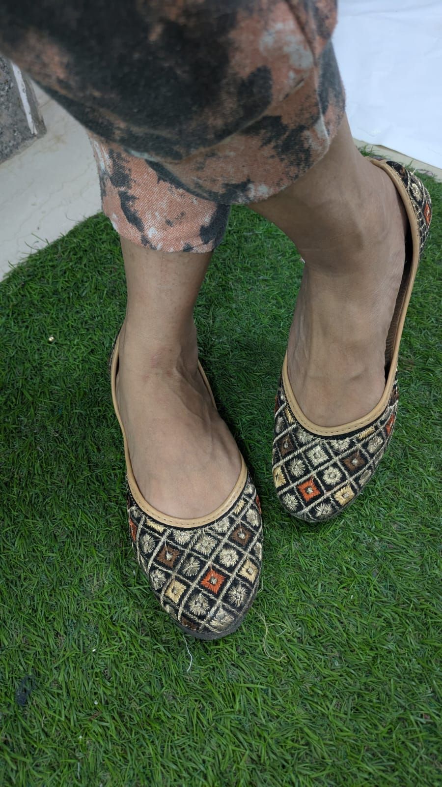 - DESIGN: Traditional ethnic Jutti-style ballet flats featuring intricate black and gold diamond pattern embroidery with striking coral accents